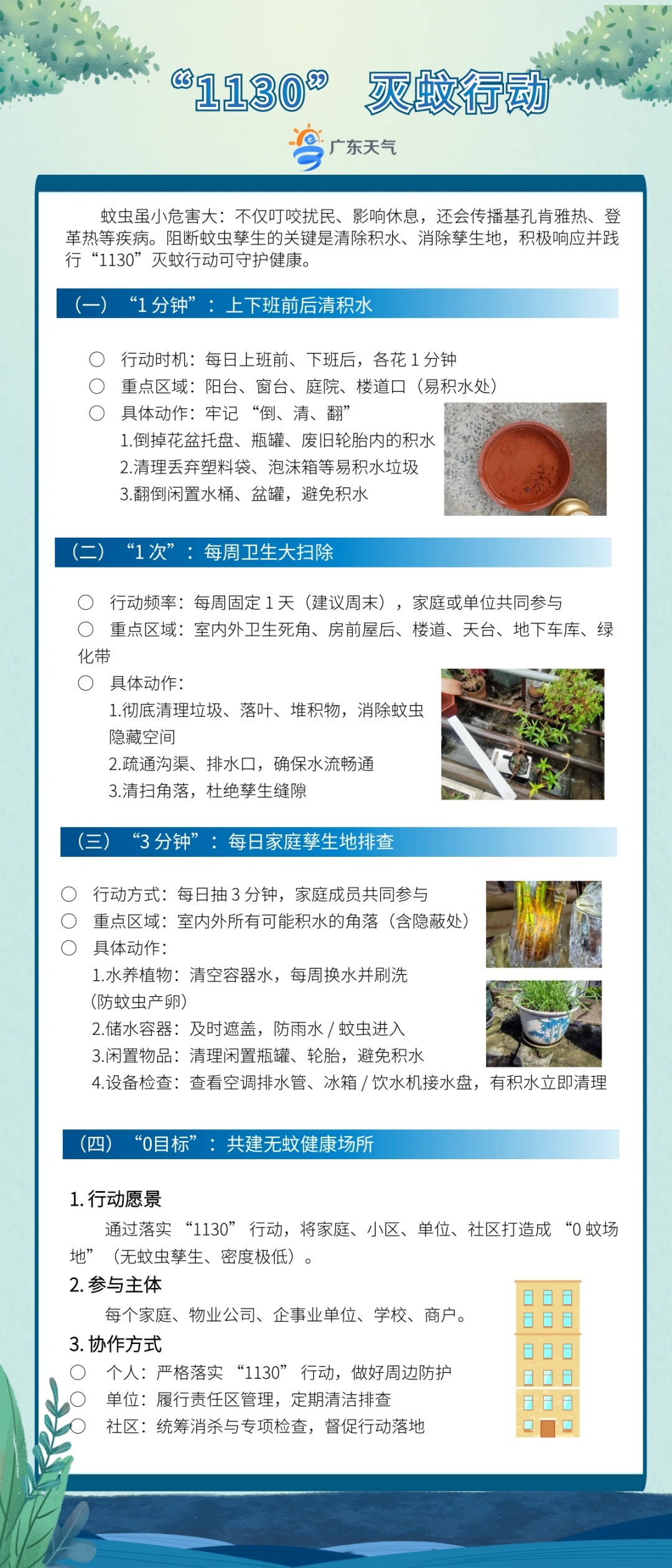 基孔肯雅热的传播媒介伊蚊偏好在小型洁净水体中繁殖。翻盆倒罐清积水,特别是清理各类容器积水,是控制疫情传播的基础。基孔肯雅热是可以通过“清积水、灭成蚊、防叮咬”来进行预防。在此,我们呼吁广大市民,积极响应省委、省政府关于开展爱国卫生运动的号召,共同参与防蚊灭蚊工作,主动挂蚊帐、装纱窗、清积水、清垃圾,结合实际点蚊香、出门涂驱蚊水、灭成蚊;积极践行“1130”防蚊灭蚊行动:上下班1分钟清积水,每周1次大扫除,每天3分钟排查孳生地,携手共建无蚊场所,筑牢群防群控防线,共建共享健康美好家园。